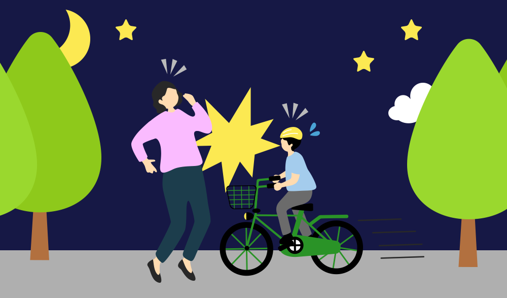 男子小学生(11歳)が夜間、帰宅途中に自転車で走行中、歩道と車道の区別のない道路において歩行中の女性(62歳)と正面衝突。女性は頭蓋骨骨折等の傷害を負い、意識が戻らない状態となった。