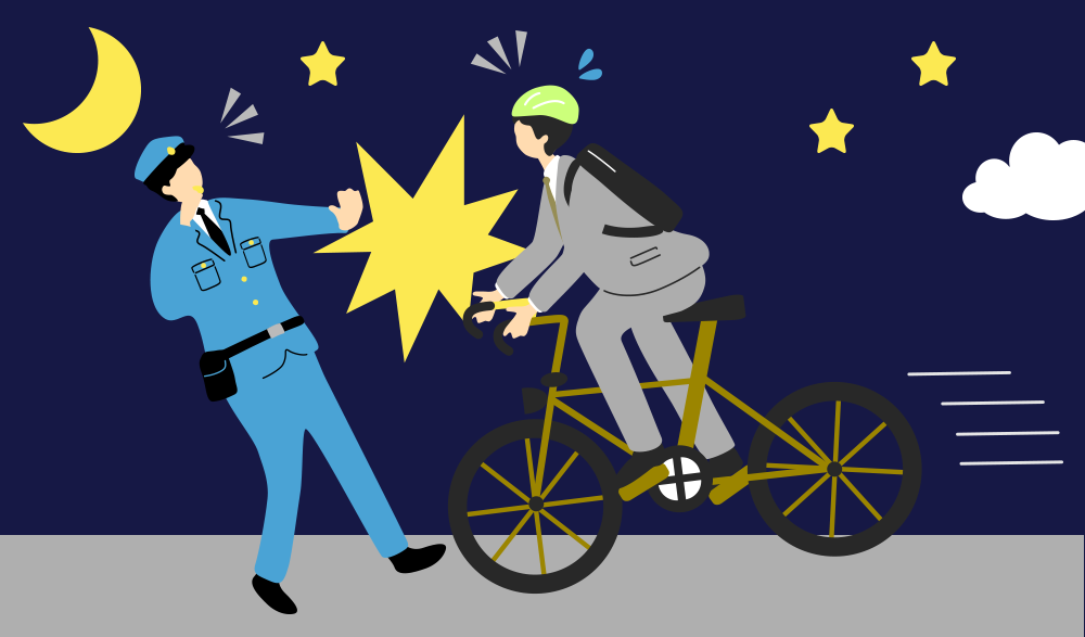 男子高校生が、夜間、イヤホンで音楽を聞きながら無灯火で自転車を運転中に、パトカーの追跡を受けて逃走し、職務質問中の警察官(25歳)と衝突。警察官は、頭蓋骨骨折等で約2か月後に死亡した。
