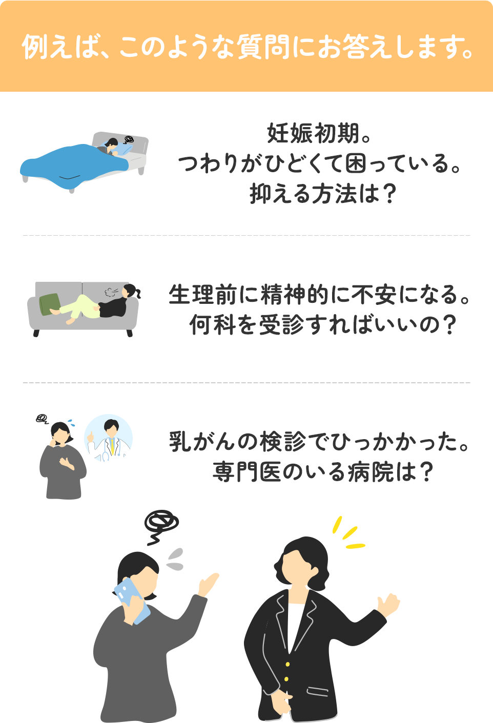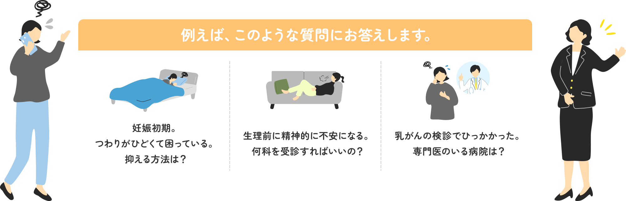 24時間年中無休で、女性に多い病気や妊娠・出産及び更年期障害等のご相談に女性の医療スタッフ(医師、保健師、看護師など)が